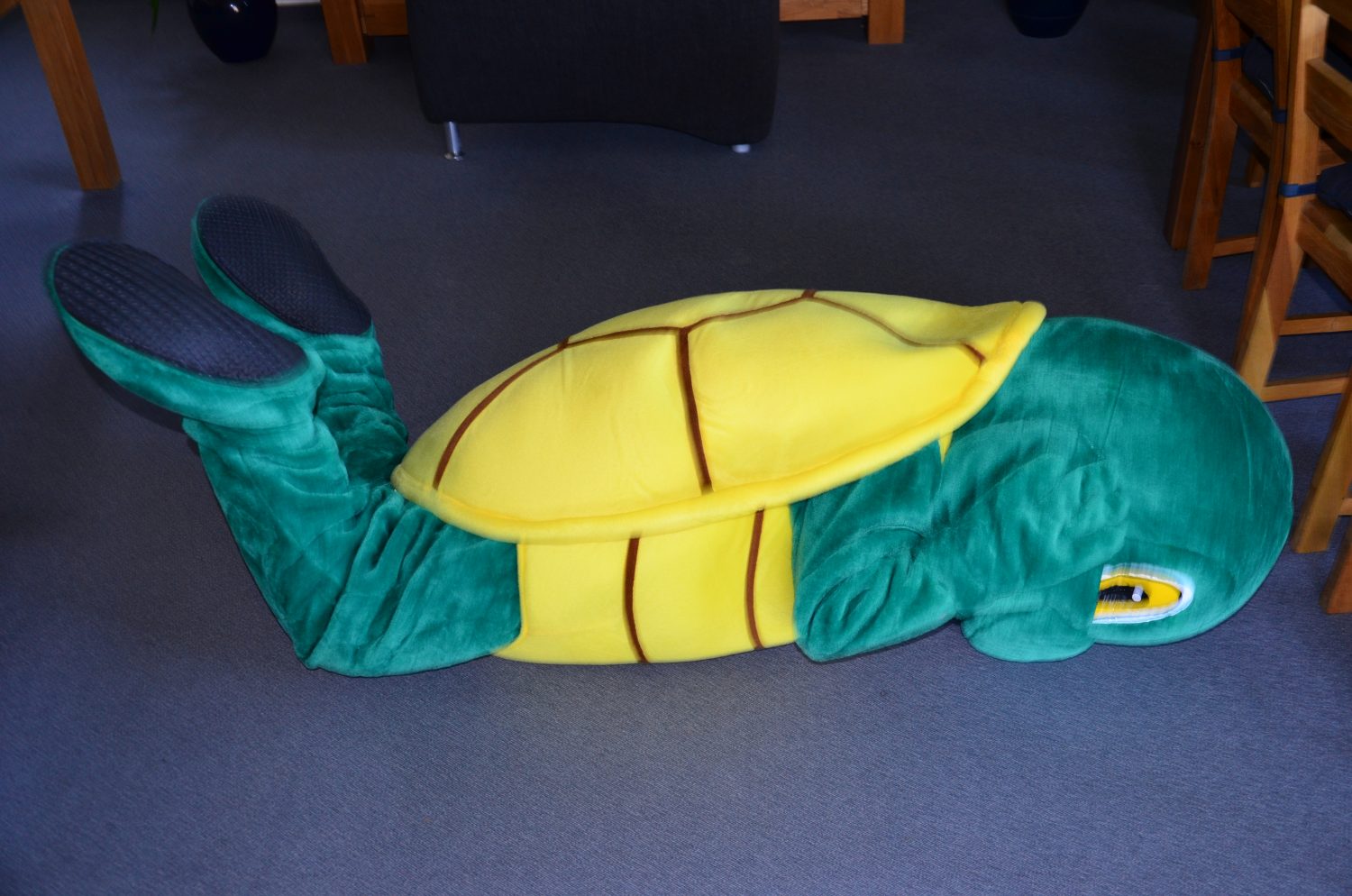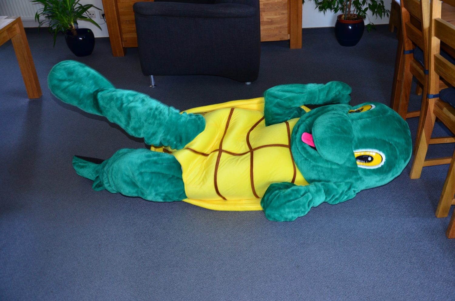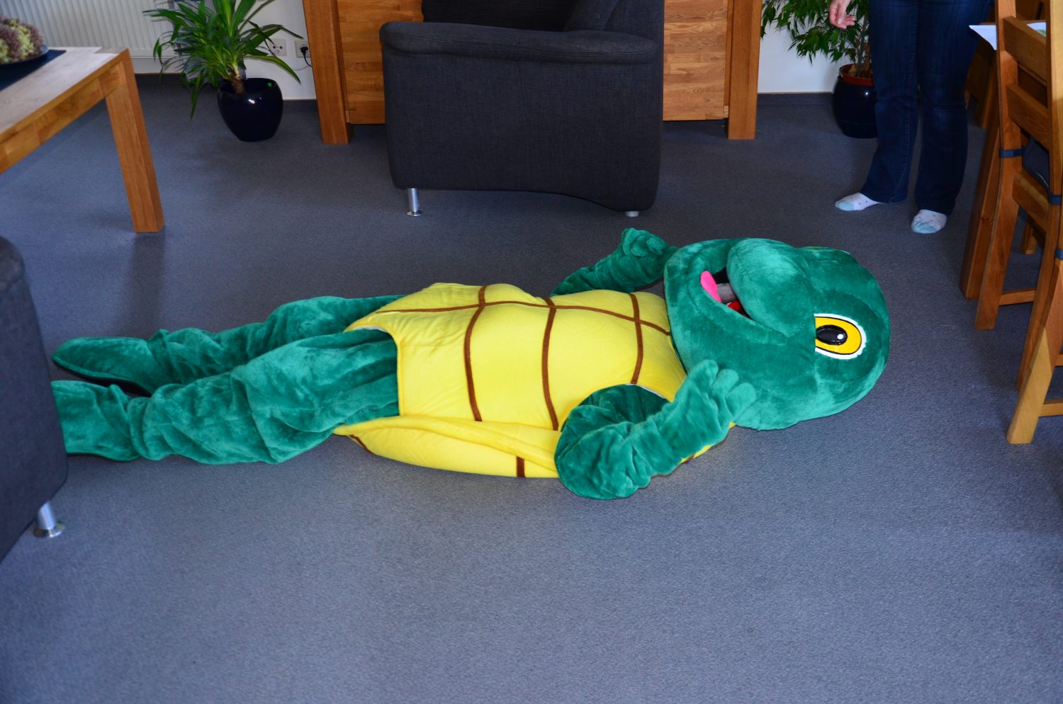 Heute brauchst du eine große freie Fläche, damit du dir nicht weh tust. Legt dich dann auf den Rücken auf den Boden. Dann kullerst du dich immer wieder über die Seite.
